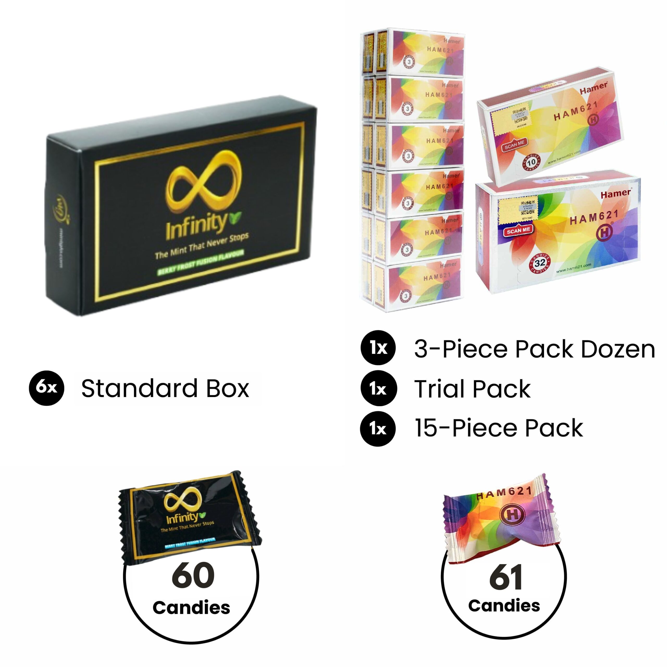 The Promo G – Power Stack Combo – 6× Infinity Mint + Hamer Mixed Pack (121 pcs) combines the clean mental energy of Infinity Mint with the long-lasting stamina of Hamer Candy. With 60 biotech-enhanced mints and 61 functional candies across three formats, this bundle is ideal for light users, gift givers, testers, and resellers looking for a compact, fully verified performance set.
